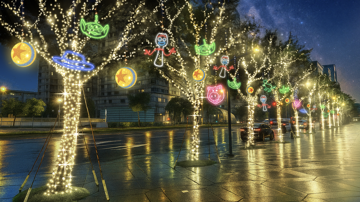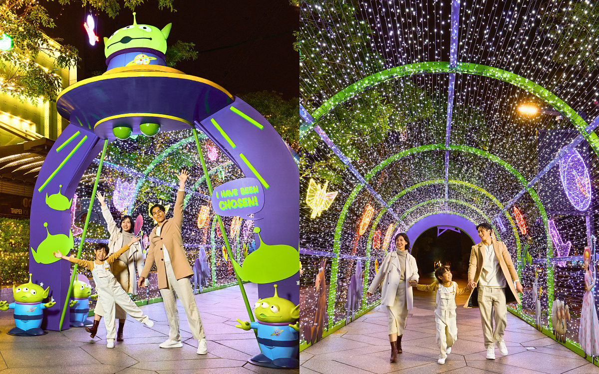 漫步在台北101四周的閃耀星光步道,展開一段奇幻旅程。在光影交織的節慶氛圍中,《玩具總動員》經典角色們悄然登場,三眼怪的奇幻光彩、胡迪牛仔帽的冒險氣息、象徵無限宇宙的星球,以及充滿童趣與創意的叉奇,串聯出整條星光大道。宛如夢境與現實交會的舞台,邀請民眾穿梭於光影之間,感受節慶歡欣與玩具世界的無限驚喜。