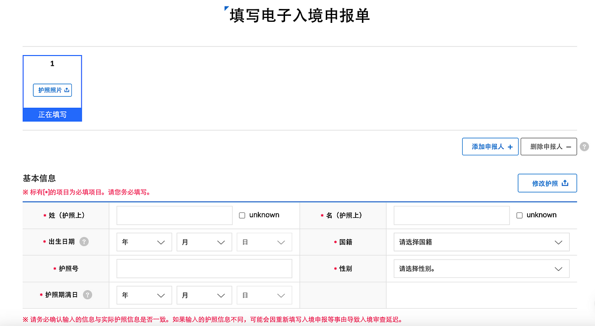 進入到韓國「電子入境申報(e-Arrival card)」系統後,首先要先選擇要進行個人申報或是團體申報,大多自由行旅客都要選擇個人申報。點選申報後會要先同意對於個人資料收集的隱私政策,接著就進入到填寫資料的頁面。「電子入境卡」需要上傳護照個人資料頁的照片、與護照上一致的個人基本資訊、入境的時間、入境的航班、入境目的以及入境後將停留的地址和聯絡方式等等。