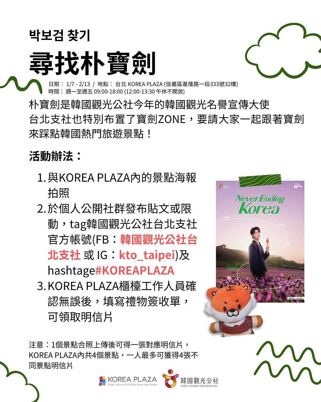 新年一開始,韓國觀光公社將於 1 月 7 日至 2 月 13 日期間,在台北 KOREA PLAZA 推出一系列精彩的迎新春主題活動。活動一大亮點,便是為韓國觀光名譽宣傳大使朴寶劍打造的專屬「寶劍ZONE」。韓國觀光公社將全羅南道新安郡的紫島主題搬進 KOREA PLAZA,現場不僅設置有朴寶劍大型背牆、人形立牌,更特設紫島熱門景點「紫色電話亭」,提供粉絲們絕佳的拍照打卡點,粉絲只要在「寶劍ZONE」完成指定拍照打卡任務,即可獲贈朴寶劍為宣傳韓國觀光,特別於忠清南道保寧市川北青麥田、首爾特別市昌德宮後苑、全羅南道麗水市蓋島青石浦海水浴場等知名景點拍攝的限量明信片,邀請粉絲循著朴寶劍的足跡,規劃一場與「寶劍同遊」的深度韓國之旅。