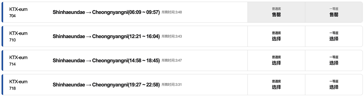 首爾清涼里站→釜山新海雲台站
