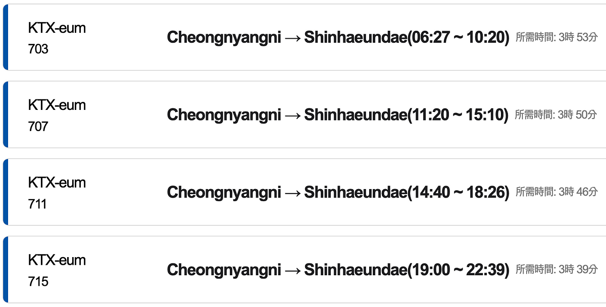 首爾清涼里站往返釜山「新海雲台站」、「Centum 站」、「機張站」三站的每日列車時刻表如下: