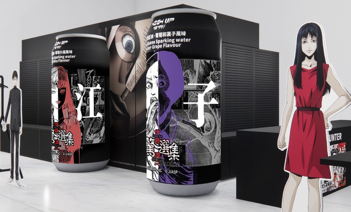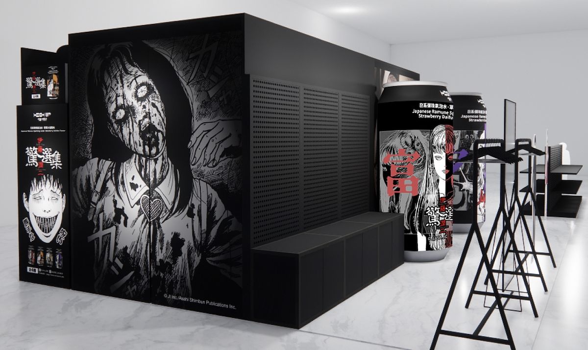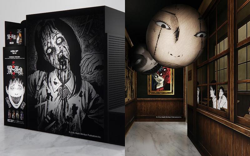 在遠方就看到有著富江、淵及蛞蝓少女等三大區的「角色合照牆」,二次元與現實邊界瞬間模糊,彷彿進入黑白分明的漫畫格中。入口處「聯名罐裝飲品充氣裝置」黑底剪影搭配大膽跳色,將富江、雙一、夕子與淵的詭譎封印其中。店內重現惡作劇少年怨念纏繞的課後空間「被詛咒的雙一教室」,小心!一坐下可能被口含鐵釘的雙一盯上,抬起頭又看到盤旋空中「巨型人頭氣球」,每秒都令人戰慄啊!接著看到絕美少女「富江」與神祕少年「押切」立牌冰冷視線直視你靈魂,一旁展現細膩卻窒息筆觸的「原畫大型背板」讓人溺於老師筆下的世界,而展場限定拍貼機旁的「淵立牌」,也許在你專注鏡頭瞬間,她早已帶著尖銳細牙悄悄靠近,粉絲們過年走春就來這啊!